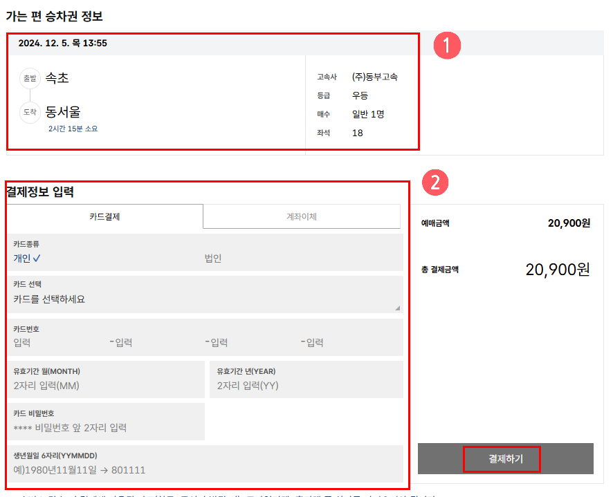 8️⃣ 마지막 ①승차권 정보를 정확히 검토하고 ②결제정보 입력란에 카드 관련 정보를 입력한 후, ③결제하기 버튼을 눌러 결제를 진행합니다.