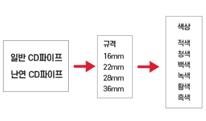 이러한 CD관의 종류에는 크게 일반 CD관과 난연 CD관으로 구분되며, 더 세분화로는 규격별, 색상별로 나뉘어 사용되고 있습니다. 일반적으로 백색 CD관 같은 경우 난연 CD관이 대부분이고, 흑색은 난연성이 없는 불에 취약한 재질로 된 CD관으로 구분되는 되고 있습니다.