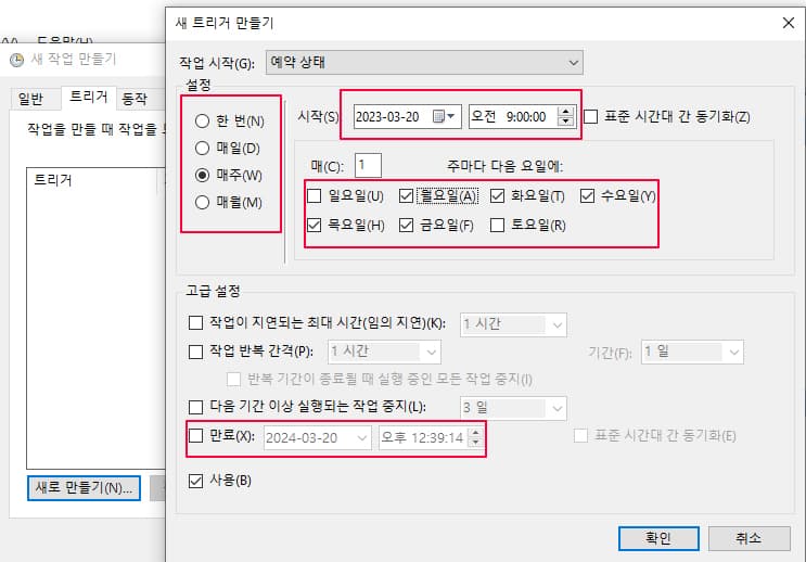 - 매주 - 설정한 시간과 요일에 작업을 하게 됩니다.